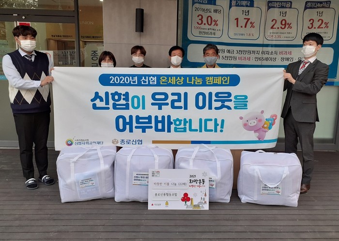종로구 종로5·6가동이 종로신용협동조합과 함께 지역내 취약 계층들의 따뜻한 겨울을 위해 ‘마음까지 따뜻한 이불 전달식’을 열고 겨울 이불 22채를 지역내 한부모 가정에 후원했다. 사진은 이불 전달식에서 기념촬영을 하고 있는 관계자들의 모습. (사진제공=종로구청)