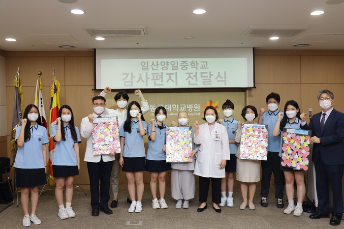 [고양=이기홍 기자] 동국대학교일산병원은 최근 일산양일중학교 학생들로부터 코로나19 극복을 위해 애쓰는 의료진을 위한 손편지와 학생들이 모금을 통해 구입한 음료수를 전달받았다.