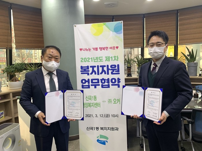 경기 의정부시 신곡1동행정복지센터가 최근 신곡권역 생활폐기물 수집·운반 위탁업체인 (주)오커와 지역내 주민의 복지지원 활동을 약속하는 복지자원 협약을 체결했다. 이번 협약으로 오커는 통합사례관리 대상 가구 중 쓰레기 처리와 청소 등여 어려움을 겪는 가구의 주거환경 개선을 지원한다. 사진은 관계자들이 기념촬영을 하는 모습. (사진제공=의정부시청)