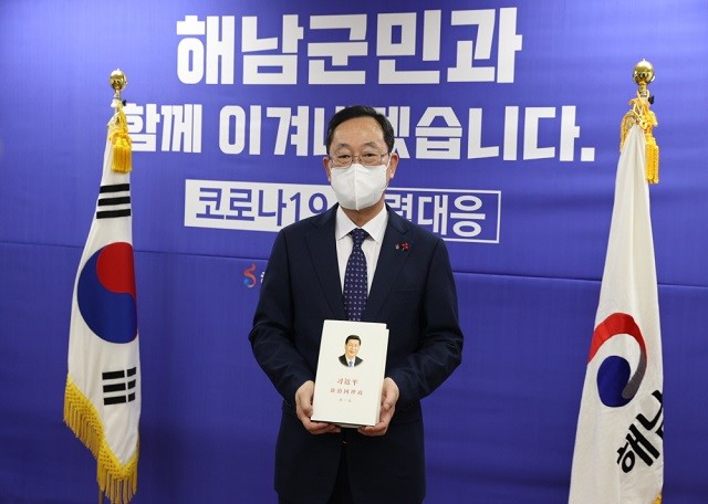 | ▲ 명현관 해남군수가 싱하이밍 중국대사로부터 전달 받은 시진핑 중국주석의 谈治国理政(담치국이정) 도서를 소개하고 있다. / 해남군 제공 |