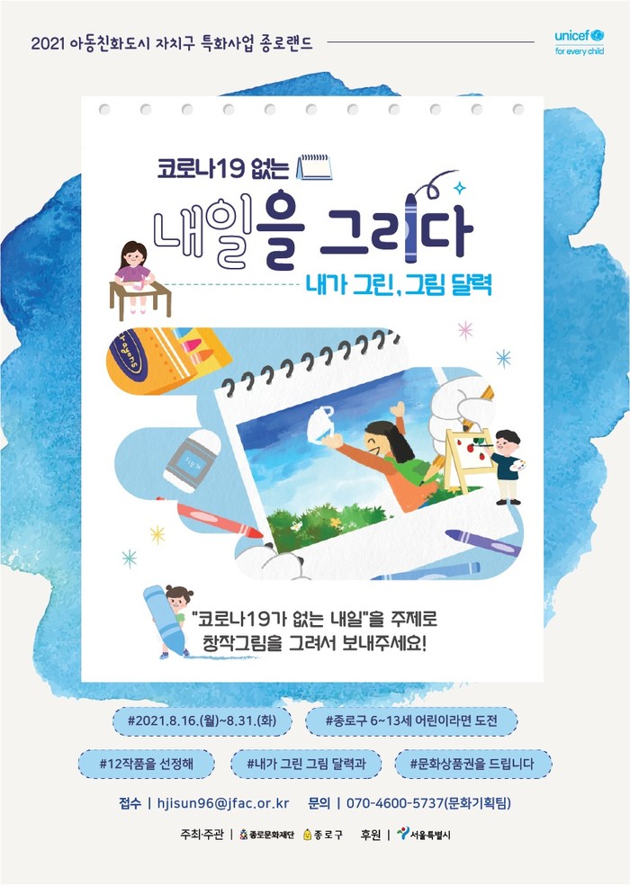 [시민일보 = 이대우 기자] 서울 종로구(구청장 김영종)가 2021 아동친화도시 특화사업의 일환으로 ‘코로나19 없는 내일을 그리다’ 창작그림 공모전을 개최한다.