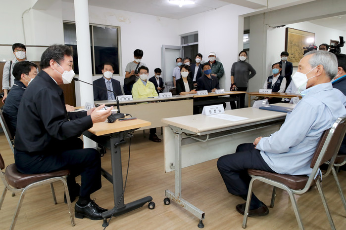 정원오 성동구청장은 지난 3일 이낙연 더불어민주당 대표와 함께 지역내 버스회사를 찾아 '필수노동자'인 버스기사들을 격려하고, 건의사항을 청취했다. 사진은 이 대표(왼쪽)와 정 구청장(가운데)이 구에 위치한 (주)태진운수를 방문해 관계자들과 간담회를 하고 있는 모습. (사진제공=성동구청)