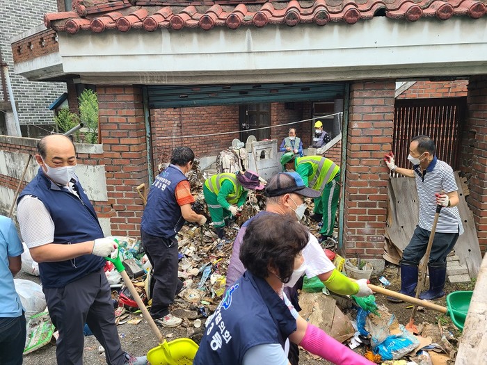 경기 수원시 권선구 세류3동행정복지센터가 최근 저장강박장애로 주택내 재활용품 등을 쌓아놓아 악취를 유발해 본인뿐 아니라 인근 주민들의 생활에도 불편을 주고 있던 노인 가구의 주거환경 개선을 위해 합동청소 활동을 전개했다. 사진은 이날 단체원과 공무원·환경관리원이 함께 청소를 하고 있는 모습. (사진제공=권선구청)