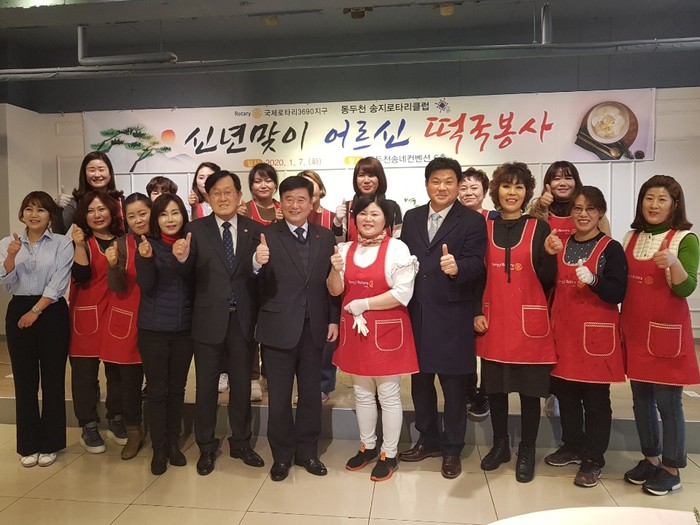 경기 동두천시자원봉사센터 송지로타리클럽이 7일 송내컨벤션에서 '신년 맞이 어르신 떡국 봉사'를 진행했다. 이날 회원 20명이 직접 끓인 떡국을 노인 180명에게 대접했다. 사진은 행사에 참석한 최용덕 시장(앞줄 가운데)과 관계자들의 기념촬영 모습. (사진제공=동두천시청)