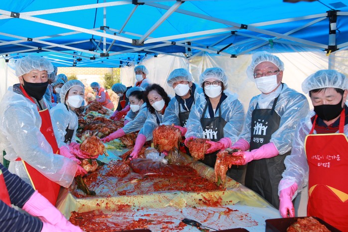 경기 수원시 장안구 파장동은 18일 새마을부녀회와 함께 ‘사랑의 김장나눔’행사를 열었다. 이날 행사에는 파장동 단체장협의회, 각급 단체원, 수원중앙로터리클럽 등에서 참여해 김장 담그기에 두팔을 걷어붙였다. 사진은 참여자들이 김장을 하고 있는 모습. (사진제공=장안구청)