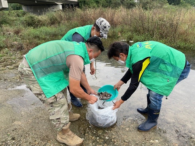 경기 포천시 영중면 새마을지도자협의회는 최근 명덕천에서 환경정화 활동을 하고, 친환경 방역과 생물의 서식처를 조성하기 위해 미꾸라지를 하천에 풀었다. 사진은 봉사자들이 명덕천에서 미꾸라지를 방생하고 있는 모습. (사진제공=포천시청)