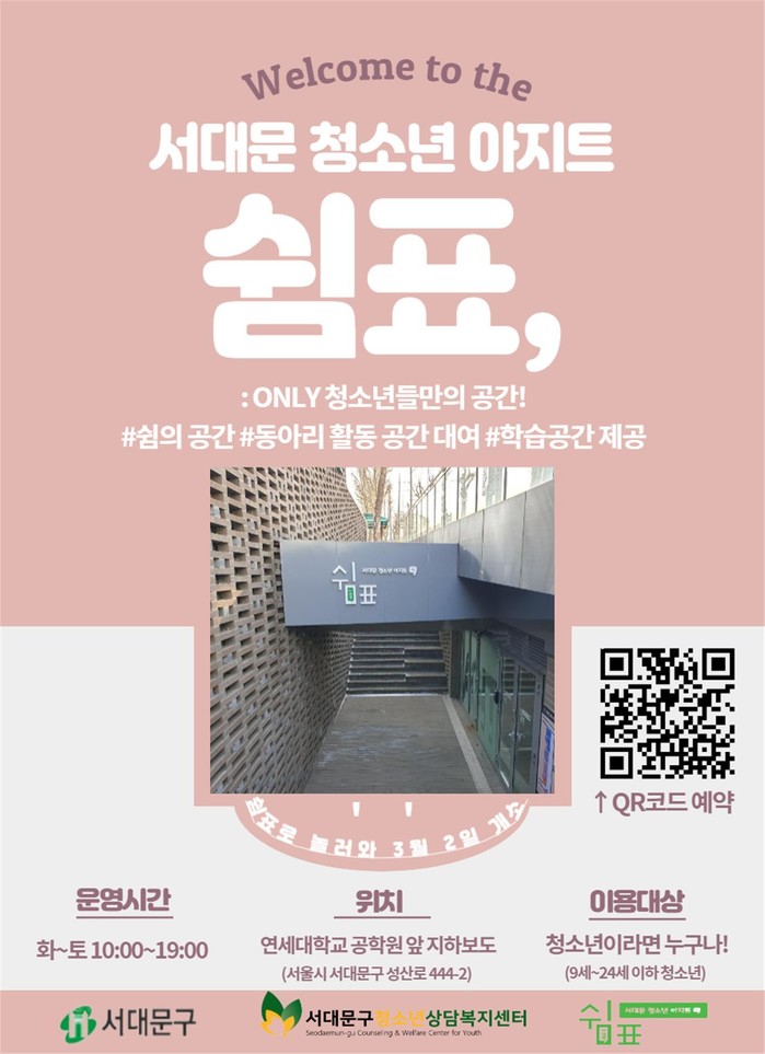 [시민일보 = 홍덕표 기자] 서울 서대문구(구청장 문석진)는 연세대학교 정문 앞 지하보도에 청소년 아지트 '쉼표'(성산로 444-2)를 올해 3월부터 문 열어 무료로 운영하고 있다고 밝혔다.