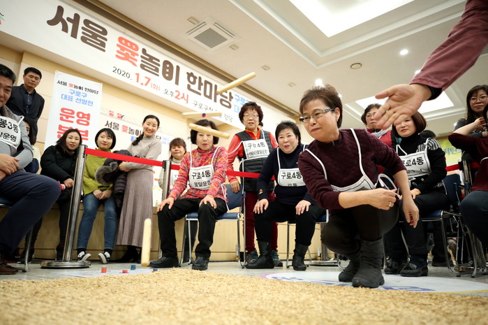 7일 서울 구로구가 구청 강당에서 ‘서울 윷놀이 한마당’ 참가 구 대표 선발전을 실시했다. 이날 선발전에서는 가리봉동팀이 우승을 차지했다. 사진은 선발전에서 윷놀이를 하고 있는 참가 주민들의 모습. (사진제공=구로구청)