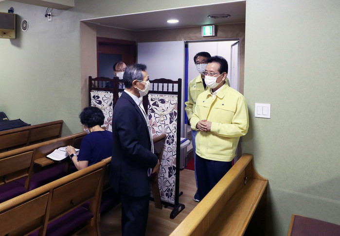 강남구(구청장 정순균)가 14일 예배를 진행하는 소규모 교회를 방문해 소모임 자제를 요청하고 ▲발열 체크 ▲마스크 착용 ▲손소독제 비치 ▲신도간 1m 거리 유지 등과 같은 7대 감염병예방수칙 준수 여부를 확인했다. 사진은 교회 관계자에 소모임 등 자제를 요청하고 있는 정순균 구청장(오른쪽)의 모습. (사진제공=강남구청)