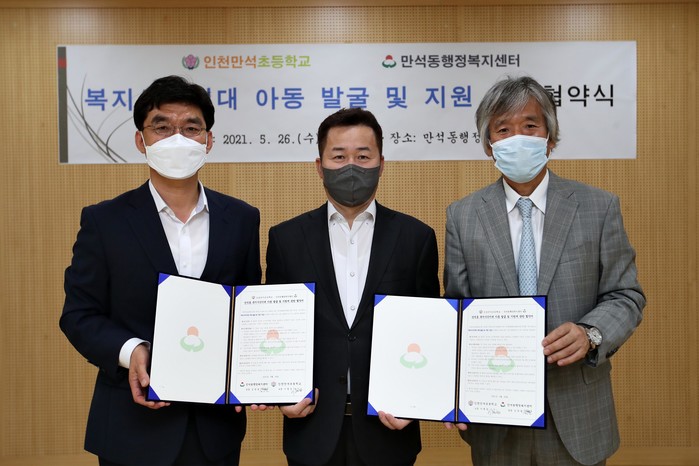 인천 동구 만석동이 지역내 아동복지 향상을 위해 26일 만석초등학교와 함께 '복지사각지대 아동 발굴 및 지원을 위한 업무협약'을 체결했다. 협약에 따라 양 기관은 긴밀한 협력을 통해 학교 내 위기가구 아동과 복지사각지대 아동을 적극 발굴하고 맞춤형 복지서비스 연계 및 체계적인 지원 관리를 한다. 사진은 이날 협약식에 참석한 허인환 구청장(가운데)이 양기관 관계자들과 기념촬영을 하는 모습. (사진제공=인천 동구청)