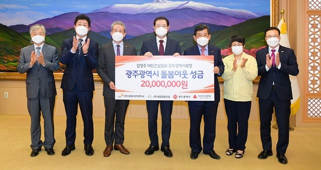 광주광역시는 25일 오전 시청 접견실에서 김영주 대한건설협회 광주시회 회장, ㈜해양도시가스, 허영호 ㈜미림산업개발 대표와 코로나19 위기극복 및 수해피해 지원을 위한 기부금 기탁식을 가졌다.