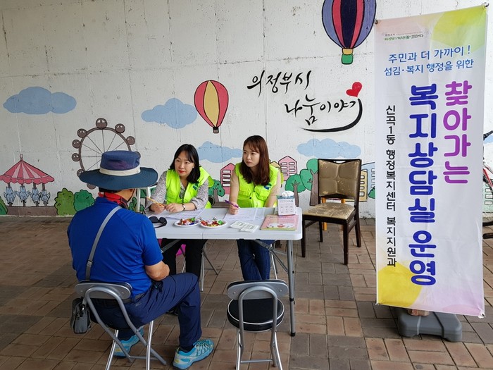 경기 의정부시 신곡1동 복지조사관리팀은 25일 장암동 동막교 부근에서 현장밀착형 복지서비스 추진을 위한 ‘찾아가는 복지상담실’을 운영했다. 사진은 관계자들이 주민과 상담을 하고 있는 모습. (사진제공=의정부시청)