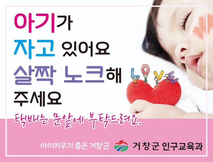 거창군은 신생아와 출산가정의 숙면에 도움을 주고 이웃들의 배려를 유도하기 위해 출산가정에 ‘아기가 자고 있어요’ 스티커를 읍·면 행정복지센터를 통해 1월 19일부터 출생 신고 시 배부한다.