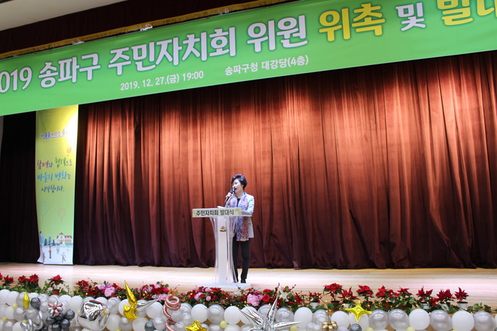 [시민일보 = 이대우 기자] 이성자 서울 송파구의장이 최근 송파구청 4층 대강당에서 열린 ‘2019 송파구 주민자치회 위원 위촉 및 발대식’ 행사에 참석했다.