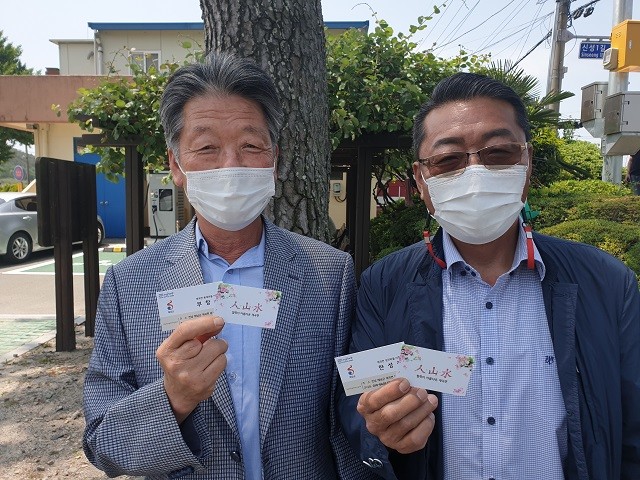 | ▲ 해남군으로부터 명함을 받고 홍보하고 있는 부창수 계곡면 이장단장(좌측), 성진리 한성철 이장 / 사진=해남군 제공 |