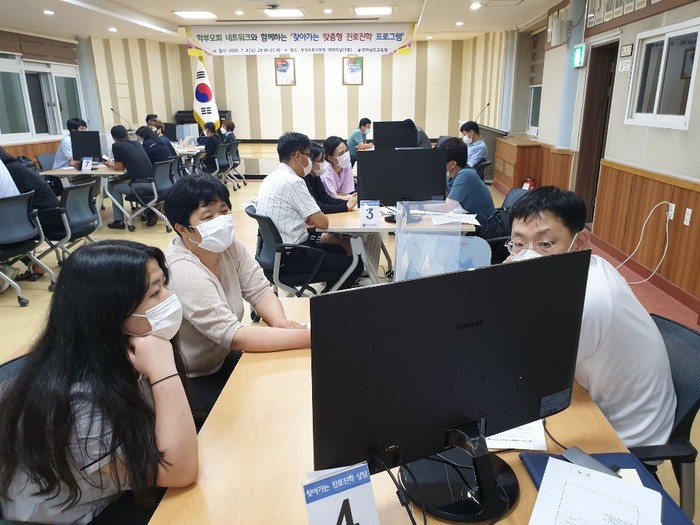 코로나19가 장기화 되고 있는 가운데 전남도교육청이 지역 고교생들을 위해 대입상담 서비스를 제공하는 '찾아가는 맞춤형 진로진학 프로그램'을 마련했다. 이 프로그램에는 현직 고등학교 교사 10명이 참여해 1대1 맞춤형 진로진학 상담을 제공한다. 사진은 지난 8일 보성군에서 학생·학부모가 상담을 받고 있는 모습. (사진제공=전남교육청)