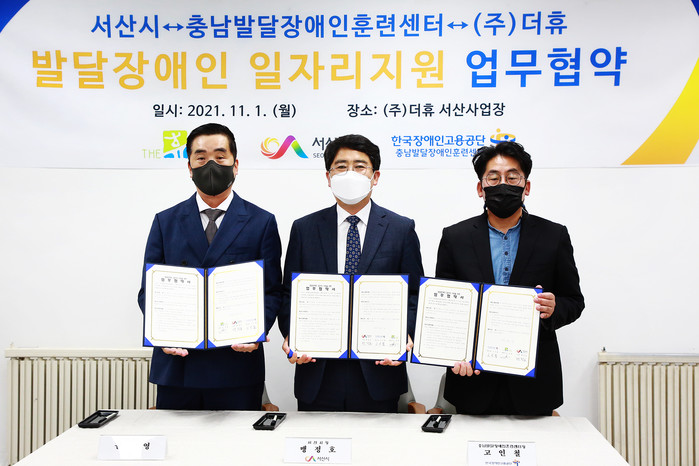 충남 서산시가 1일 한국장애인고용공단 충남발달장애인훈련센터, (주)더휴와 발달장애인 일자리 지원 업무협약을 체결했다. 협약을 통해 세 기관은 발달장애인 일자리지원을 위한 정보공유 등에 적극 협력하기로 했다. 사진은 협약식에서 맹정호 시장(가운데)과 관계자들이 기념촬영을 하는 모습. (사진제공=서산시청)