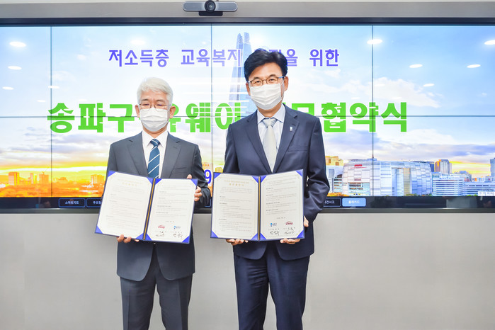 서울 송파구가 1일 송파구청에서 온라인 교육업체인 (주)유웨이와 저소득층 교육복지를 위한 업무협약을 맺고, 오는 2021년 2월까지 입시상담 지원을 시작한다. 사진은 협약식에서 박성수 구청장(오른쪽)과 관계자가 기념촬영을 하는 모습. (사진제공=송파구청)