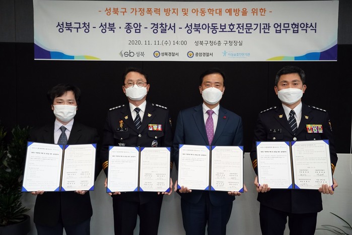 서울 성북구가 최근 성북·종암경찰서·성북아동보호전문기관과 가정폭력 및 아동학대 대응을 위한 '위기가정통합지원 및 아동학대예방 업무협약'을 체결했다. 사진은 협약식에서 이승로 구청장(오른쪽 두 번째)과 협약기관 관계자들이 기념촬영을 하는 모습. (사진제공=성북구청)