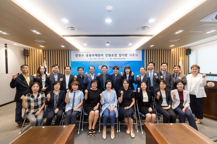4일 서울 양천구청 공감기획실에서 민원이 발생한 공동주택을 찾아가 민원 내용을 조사하고 중재·조정하는 역할을 하는 ‘공동주택관리 민원조정 감사관 위촉식’이 진행됐다. 사진은 감사관들과 기념촬영을 하고 있는 김수영 구청장(앞줄 가운데)의 모습. (사진제공=양천구청)