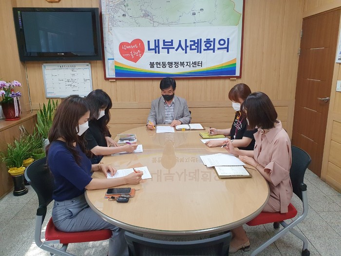경기 동두천시 불현동행정복지센터가 최근 복합적인 위기 상황에 놓인 가구에 맞춤형 복지서비스를 제공하기 위해 내부사례회를 열었다. 이날 회의에서는 대상 가구 선정과 함께 의료비 지원, 경제적 부담을 줄여줄 수 있는 공적급여 연계와 이혼 소송 관련된 법적 상담 지원 및 우울증에 대한 관리를 받을 수 있도록 시 정신건강복지센터 연계 등을 결정했다. 사진은 이날 회의가 진행되고 있는 모습. (사진제공=동두천시청)