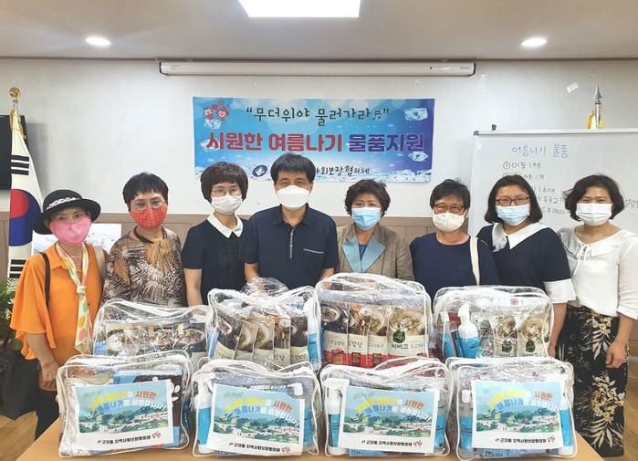 서울 광진구 군자동 주민센터와 군자동지역사회보장협의체가 지난 7월30일 지역내 홀몸노인 12가구에 시원한 여름나기 지원 물품(인견 홑이불과 쿨스카프, 간편 식료품 등)을 집으로 직접 전달했다. 사진은 전달식에서 지역사회보장협의체 위원들이 기념촬영을 하는 모습. (사진제공=광진구청)