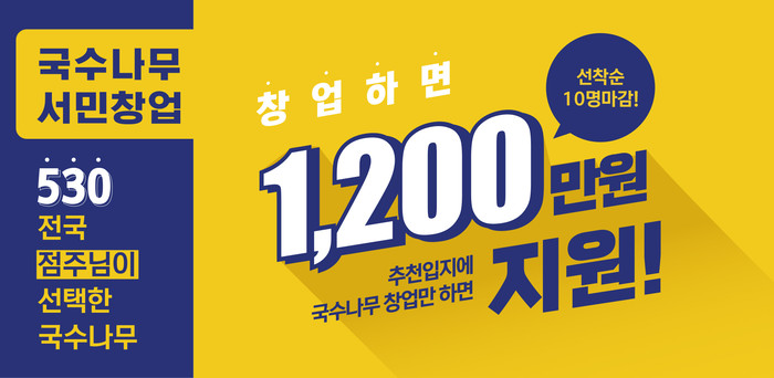 이번 창업박람회에서 국수나무는 서민창업의 힘이 되는 국민창업을 내걸고 약 1200만원 창업비용을 지원할 예정이다. 총 1억원 규모의 혜택을 예비계약자들에게 선착순으로 제공할 계획이다.