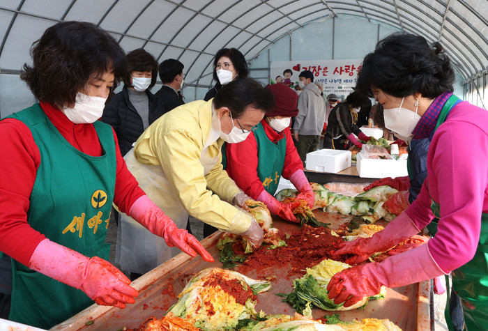 정순균 서울 강남구청장은 지난 14일 지역내 ‘따뜻한 겨울보내기, 사랑의 김장담그기’에 참여해 세곡동 주민과 강남생태보존위원회 및 바르게 살기 운동협의회 회원 등과 함께 직접 김치를 담갔다. 사진은 정 구청장(왼쪽에서 두 번째)이 김장을 하고 있는 모습. (사진제공=강남구청)