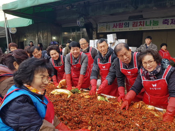 인천 부평구 부평깡시장 상인회는 지난 3~4일 시장내 협신마당에서 시장 상인과 자원봉사자 등 60여명이 참여한 가운데 ‘사랑의 김장 나눔’ 행사를 개최, 김치 약 1000포기를 담가 지역내 홀몸노인 등에 전달했다. 사진은 김장을 하는 모습. (사진제공=부평구청)