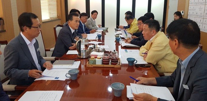 최근 아프리카돼지열병이 경기 파주시 농가에 이어 연천군 농가에서도 발생된 가운데 지난 19일 이항진 여주시장이 간부 공무원들과 '긴급 비상대책회의'를 열고 아프리카돼지열병 발생현황 파악과 예방대책을 철저히 마련하라고 지시했다. 사진은 회의 진행 모습. (사진제공=여주시청)