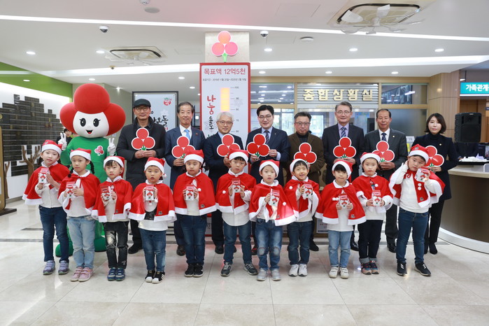최근 이정훈 서울 강동구청장이 구청 본관 1층에서 진행된 ‘사랑의 온도탑 제막식’에 참석해 오는 2020년 2월19일까지 진행되는 ‘2020 희망온돌 따뜻한 겨울나기 캠페인’의 시작을 알렸다. 사진은 이 구청장(뒷줄 왼쪽에서 네 번째)이 아이들과 함께 기념촬영을 하고 있는 모습. (사진제공=강동구청)