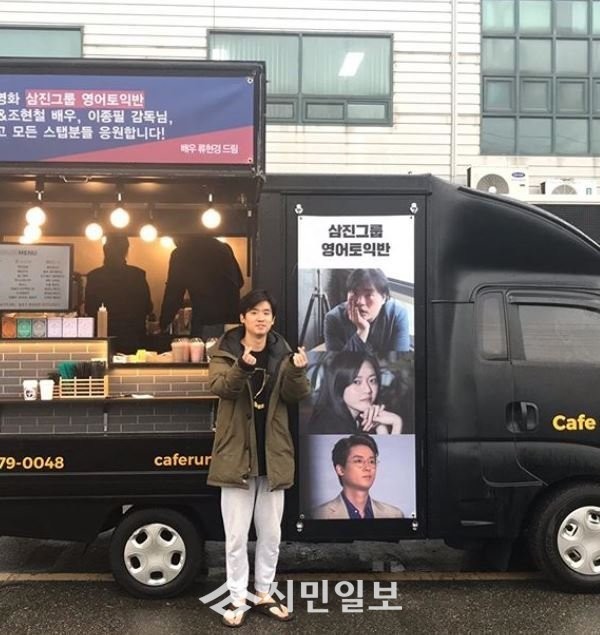 공개된 사진 속 조현철은 류현경이 보내준 커피차 앞에서 손하트를 날리고 있는 모습으로 훈훈함을 자아냈따.