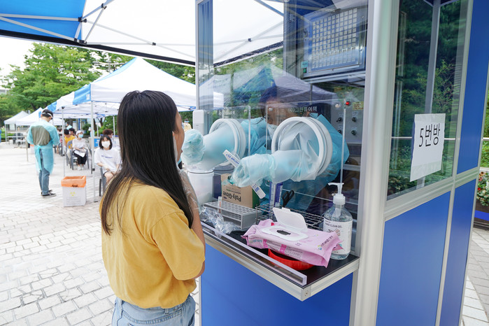 서울 동대문구가 최근 수도권에서 코로나19 확진자가 폭발적으로 증가함에 따라 확산 방지를 위해 총력을 다해 전수조사를 실시하고 있다. 구는 지난 22~24일 구청 앞마당에 선별진료소를 추가로 설치하고 검사를 진행했다. 사진은 구청 앞에 추가 설치된 선별진료소에서 검체를 채취하고 있는 모습. (사진제공=동대문구청)