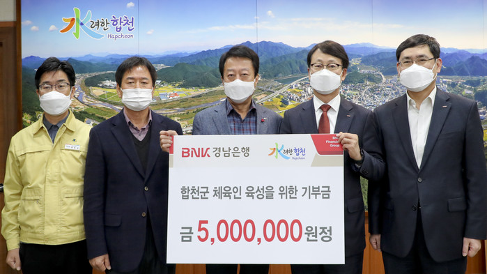 합천군수실에서 열린 기탁금 전달식에는 문준희 합천군수, 고영준 경남은행 서부영업본부 상무, 김재년 경남은행 합천지점장 등 관계자 6명이 참석했다.