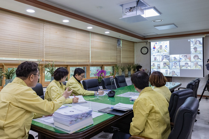 광진구가 18일 구청장실에서 최근 이슈되고 있는 코로나19 및 제설 대책에 대해 각 동장과의 영상회의를 개최했다. 이번 회의는 비대면 양방향 시스템을 구축해 화상으로 진행된 것으로, 주민과의 접점에 있는 동주민센터와 신속하게 현장 상황 및 정보를 공유하고, 빠른 의사 결정을 진행하기 위해 마련됐다. 사진은 김선갑 구청장이 각 동장과 영상회의를 진행하는 모습. (사진제공=광진구청)