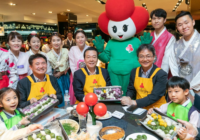 서울 강서구는 4일 공항컨벤션웨딩홀(강서로 357) 그랜드홀에서 ‘오순도순 한가위 송편 나눔’ 행사를 개최해 어려운 이웃에게 전달할 송편선물세트를 만들었다. 사진은 노현송 구청장과 주민들이 선물세트를 포장하고 기념촬영을 하는 모습. (사진제공=강서구청)