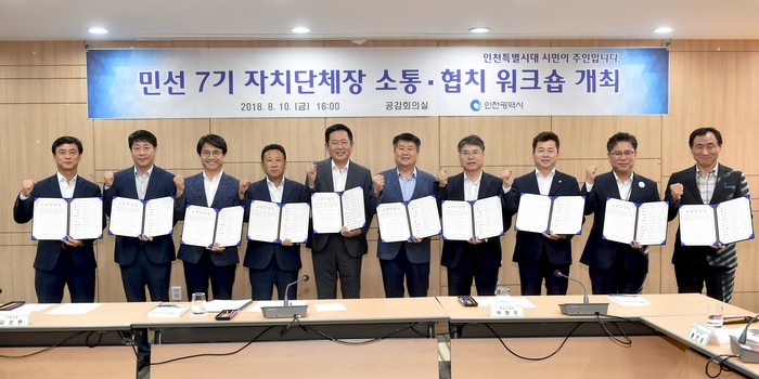 ▲ 지난해 8월 진행된 '민선 7기 자치단체장 소통·협치 워크숍. -군·구 상생협력 특화 일자리 공동선언문' 체결 후 기념촬영을 하고 있는 자치단체장들. (사진제공=인천시청) |