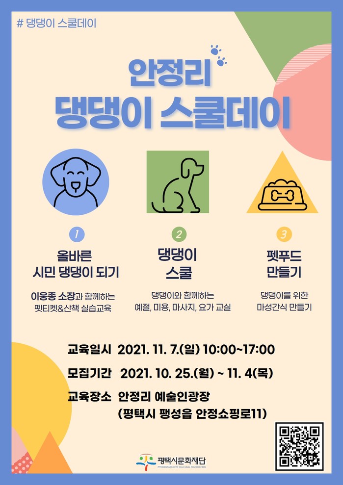 이번 교육은 반려견과 함께 생활하는 평택시민이라면 누구나 무료로 참여할 수 있으며, 온라인 사전예약을 통해 신청할 수 있다. 사전예약은 평택시문화재단 홈페이지에서 할 수 있으며, 관련 문의는 평택시문화재단 안정리 예술인광장으로 하면 된다.