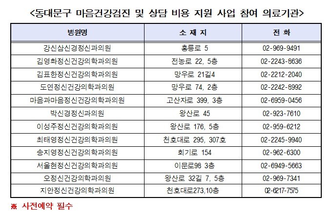 동대문구 보건소는 지역내 12개 정신건강의학과와 협약을 맺어 주민들의 마음건강검진 및 상담비용을 지원하고 있다. 심한 스트레스나 우울감 등 기타 심리적 어려움이 있는 구민은 누구나 정신건강전문의에게 검진 및 상담을 받아볼 수 있다.