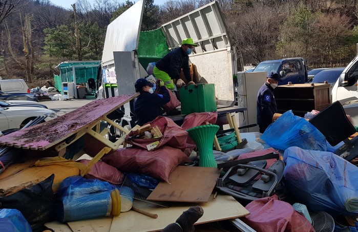 중랑구 신내2동 주민센터 직원12명이 지역자활센터 청소사업단 도우미 7명 등과 함께 최근 신내10단지 저장강박 홀몸노인 가정을 방문해 집안에 쌓여있던 각종 쓰레기 15톤 쓰레기를 치우며 소독 방역과 도배 장판 등 전반적인 주거 환경 개선을 위해 구슬땀을 흘렸다. 사진은 청소행정과 기동대에서 집안에 쌓여있던 각종 쓰레기를 차량에 싣고 있는 모습. (사진제공=중랑구청)