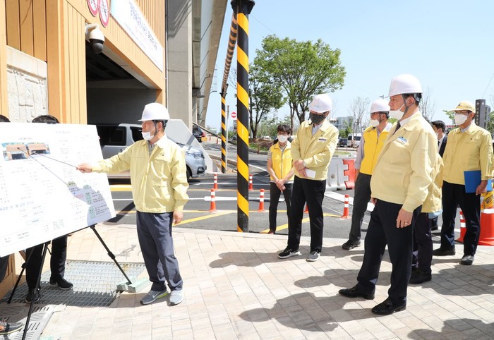 유동균 서울 마포구청장이 올해 여름철 수방 대비를 위해 최근 망원1빗물펌프장에서 열린 빗물펌프장 및 망원육갑문 시운전 현장에 참석해 시설을 점검했다. 사진은 육갑문 시운전 점검 전 현장 관계자로부터 설명을 듣는 유 구청장의 모습. (사진제공=마포구청)
