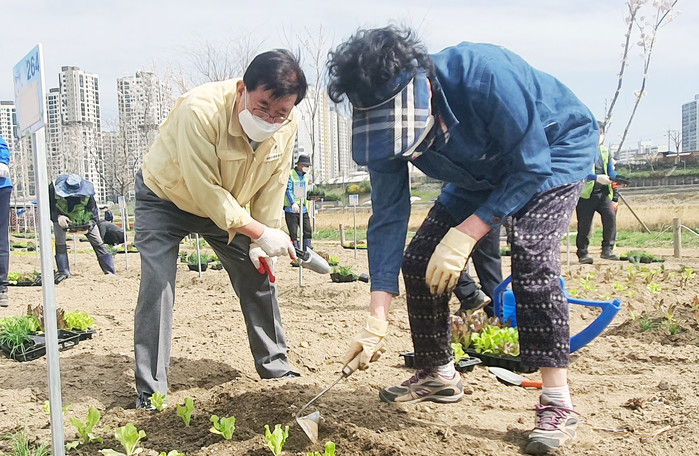 동대문구는 최근 중랑천 둔치 제2체육공원(장안교 하부)에 있는 중랑천 도시농업 체험학습장을 비대면으로 개장했다. 체험장은 약 4500㎡·630구획으로 구획당 약 5㎡다. 사진은 유덕열 구청장(왼쪽)이 최근 체험학습장을 방문해 상추 모종을 심고 있는 모습. (사진제공=동대문구청)