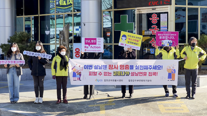 합천군 자원봉사센터(센터장 이규수)는 8일 오전 10시부터 11시까지 합천읍 군청사거리와 왕후쉼터 등에서 ‘설날연휴 집콕 캠페인’을 진행했다.