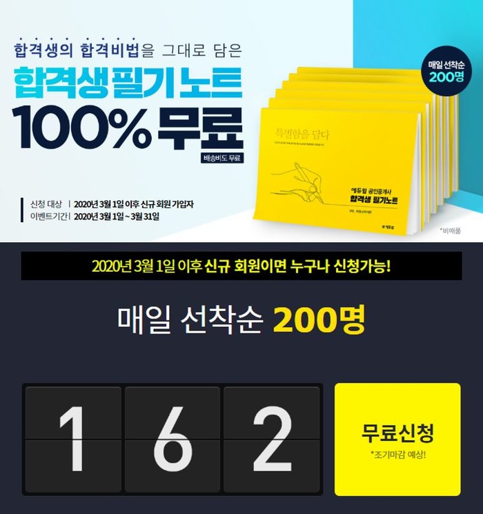 해당 이벤트는 이달 말일까지 매일 선착순 200명에게 제공하며, 3월1일 이후 에듀윌에 신규 가입한 회원이라면 누구나 신청할 수 있다.
