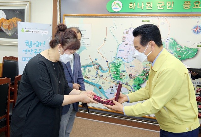 | ▲ 전동평 영암군수가 7일 군수실에서 국방부장관을 대신해 6.25 당시 12사단 소속으로 전투에 참가해 공을 세운 故전영호 중위의 유족인 전미나씨에게 화랑무공훈장과 훈장증을 전수하고 있다. / 영암군 제공 |