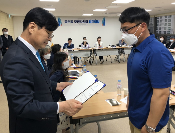 세종시 종촌동이 7일 종촌동 복합커뮤니티센터에서 주민자치회 위원 22명에 대한 위촉식을 개최했다. 이날 공개추첨을 통해 회장에 이경숙 위원, 부회장에 김국일·김윤정 위원이 각각 선출됐다. 사진은 위촉장을 수여하고 있는 모습. (사진제공=세종시청)