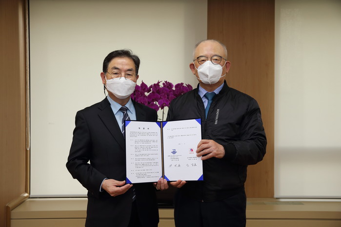 | ▲ 11월12일 부영그룹 본사에서 용산공고 강성봉 교장(왼쪽)과 부영그룹 신명호 회장이 기숙사 무상 건립 제공 업무 협약을 맺고 기념촬영을 하고 있다.(사진제공=부영그룹) |