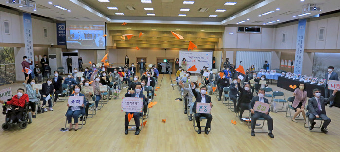 서울 서대문구가 장애인의 날을 기념해 지난 20일 ‘2021년 장애인 한가족 한마당’을 열었다. 행사는 기념식과 장애복지 유공자 표창 등으로 진행됐으며 인터넷으로 실시간 중계됐다. 사진은 행사에서 문석진 구청장(앞줄 왼쪽 세 번째)이 참가자들과 종이비행기를 날리는 퍼포먼스를 펼치고 있는 모습. (사진제공=서대문구청)