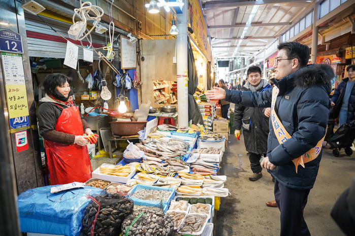 이정훈 서울 강동구청장은 21일 민족 고유 명절인 설을 앞두고 암사종합시장과 고분다리전통시장을 방문해 상인들을 격려하고 전통시장 활성화를 위한 홍보활동을 펼쳤다. 사진은 이 구청장(오른쪽)이 상인과 인사를 나누는 모습. (사진제공=강동구청)