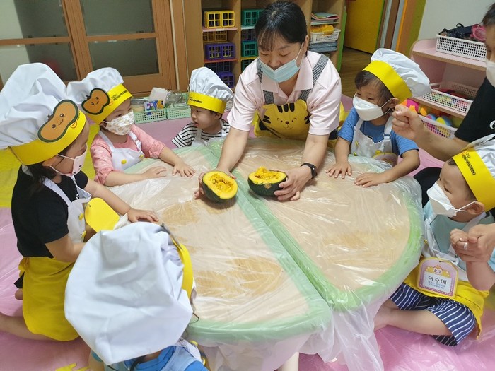 경기 구리시어린이급식관리지원센터가 오는 10월까지 '냠냠! 킁킁! 무슨 채소일까?' 어린이 방문교육을 실시한다. 이번 교육에서는 식재료를 활용한 오감활동, 자기 주도적인 요리·미술 활동 등을 진행한다. 사진은 단호박을 주제로 센터 가입 어린이시설 유아들에게 교육을 진행하고 있는 모습. (사진제공=구리시청)